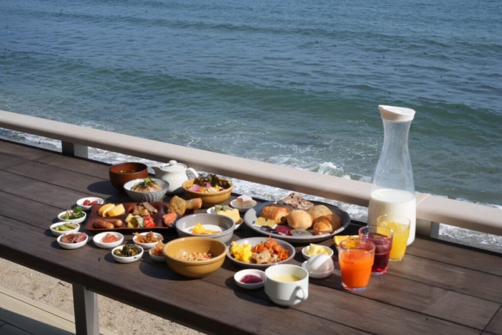 朝はレストランで糸島食材たっぷりのブッフェ。糸島の海を一望しながらパンや彩り豊かなサラダ、和惣菜まで揃い、つい長居したくなる朝の贅沢。