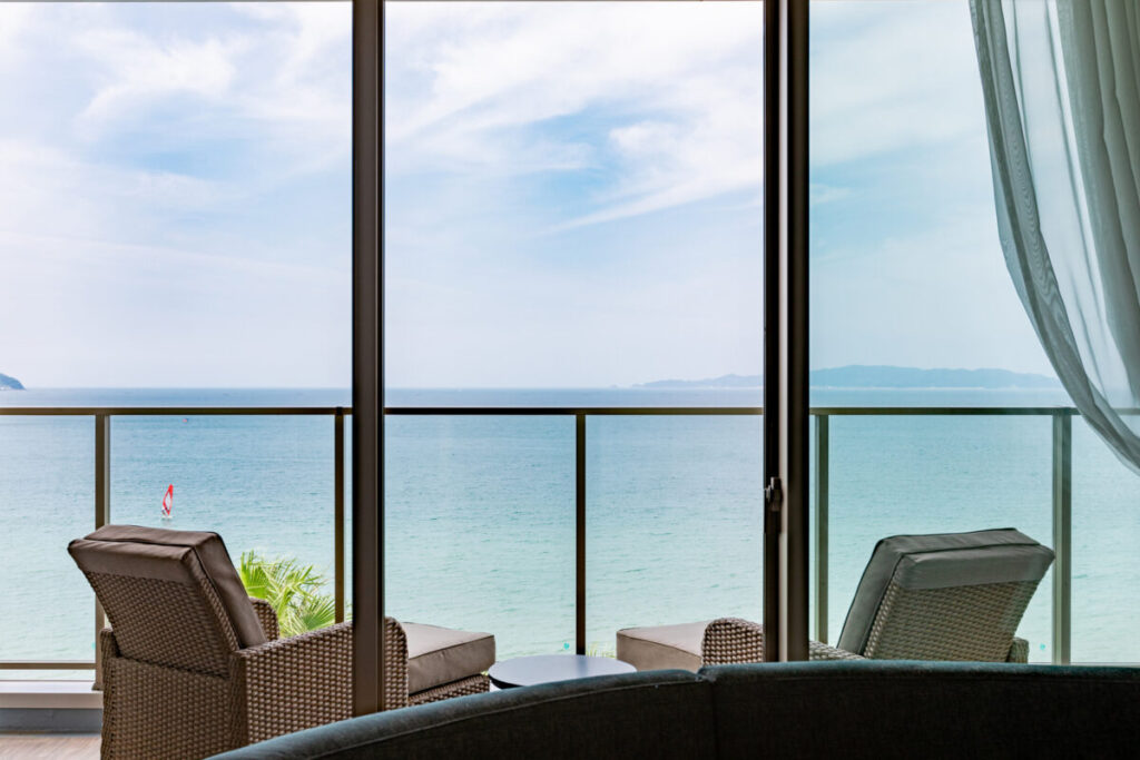 窓いっぱいに広がる青い海と、海外リゾートを思わせる空間の中で、写真映えも抜群の特別なひとときを。